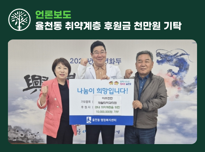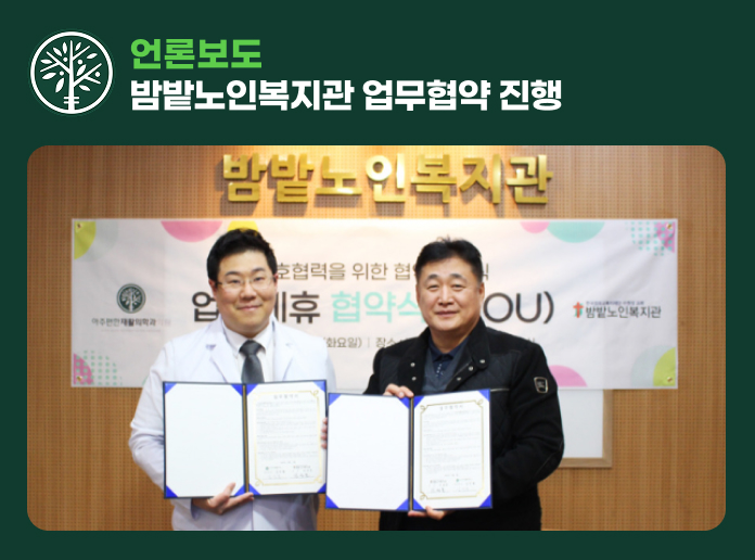 병원소식 협력기관 사회활동 언론보도 언론보도 경기체중,체고 MOU 아주편한재활의학과&경기체중,체고 업무협약 체결학생선수 건강 관리 및 재활 지원을 위한 업무협약 체결 하였습니.. 2026.01.19 밤밭노인복지관 후원자의밤 아주편한재활의학과&밤밭노인복지관 후원자의밤 김민철 대표원장이 밤밭노인복지관장 감사장.. 2026.01.19 밤밭노인복지관 MOU 아주편한재활의학과&밤밭노인복지관 업무협약 진행지역사회 어르신들의 복지 증진을 위해 아주편한.. 2025.11.17 목디스크 의심, 근전도검사로 원인 파악 스마트폰의 확산과 함께 현대인의 목 건강에 대한 우려가 커지고 있다. 정보통신정책연구원(KISDI.. 2025.11.17 푸르메천사가게 김민철 원장 인터뷰 오랜만에 참 반가운 연락을 받았습니다. 봉사자로, 기부자로, 시민 홍.. 2025.11.17 초록우산 경기지역본부 그린리더 위촉 초록우산 경기지역본부는 김민철 아주편한재활의학과의원 대표원장을 후원자 그룹 그린리더로 위촉했다고 .. 2025.10.27 율천동 지역사회보장협의체 업무협약 수원시 장안구 율천동 행정복지센터와 율천동 지역사회보장협의체(민간위원장 고재화)는 지난 .. 2025.10.27 우수한 진료 인프라 갖춘 지역 의료기관 “따뜻한 마음과 손길을 전하는 병원, 아주 편하고 좋은 이웃과 같은 의사가 되겠습니다.” 김민철 .. 2025.10.27 적십자 명예장 수상 “앞으로도 더 많은 사람을 돕기 위해 노력하겠습니다.”대한적십자사 경기도지사로부터 회원유공장 명예.. 2025.10.27 적십자회원유공장 명예장 수상 아주편한재활의학과의원이 대한적십자사 경기지사로부터 회원유공장 명예장을 수여받았다.아주편한재.. 2025.10.27 율천동 취약계층 후원금 천만원 기탁 수원시 장안구 율전동 소재 아주편한재활의학과의원은 지난 24일, 관내 취약계층을 위해 천만 원을 .. 2025.10.27 로봇 손 재활 치료기 ‘핸드오브호프’ 도입 고령화로 질환의 예방과 치료뿐만 아니라 '재활'에 대한 관심이 커진 가운데 수원시 장안구에 위치한.. 2025.10.27 아주편한재활의학과 오픈 아주편한재활의학과의원(수원, 대표원장 김민철, 사진)이 1월 11일 개원, 진료를 시작했다.진료과.. 2025.10.27