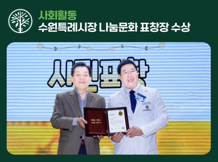 병원소식 협력기관 사회활동 언론보도 수원특례시장 나눔문화 표창장 수상 수원특례시장 나눔문화 표창장 수상 2026.03.13 뉴스리포트 2025 한국을 빛낼 우수전문의 기재 뉴스리포트 2025 한국을 빛낼 우수전문의 기재 2025.11.14 밤밭노인복지관 업무협약체결 밤밭노인복지관 업무협약체결 2025.11.14 밤밭노인복지관 건강강좌 강의 밤밭노인복지관 건강강좌 강의 2025.11.14 율천동 설 명절 이웃사랑 나눔 전달 2025년 1월 14일 율천동 설 명절 이웃사랑 나눔 전달 2025.11.14 열린의사회 괴산 의료봉사활동 열린의사회 괴산 의료봉사활동 2025.11.14 열린의사회 연천 의료봉사활동 열린의사회 연천 의료봉사활동 2025.11.14 성균관대 중간고사, 기말고사 간식지원 성균관대 중간고사, 기말고사 간식지원 2025.11.14 [푸르메천사가게] 김민철 원장 인터뷰 [푸르메천사가게] 김민철 원장 인터뷰 2025.09.15 한국브랜드 소비자평가 대상 2년연속 수상 한국브랜드 소비자평가 대상 2년연속 수상 병의원[신경차단술주사, 비수술치료] 부분 2025.09.15 사랑의 연탄봉사 사랑의 연탄봉사 2025.09.15 대한적십자사 헌혈유공패 아주편한재활의학과 김민철 원장 헌혈유공패 2025.09.15
